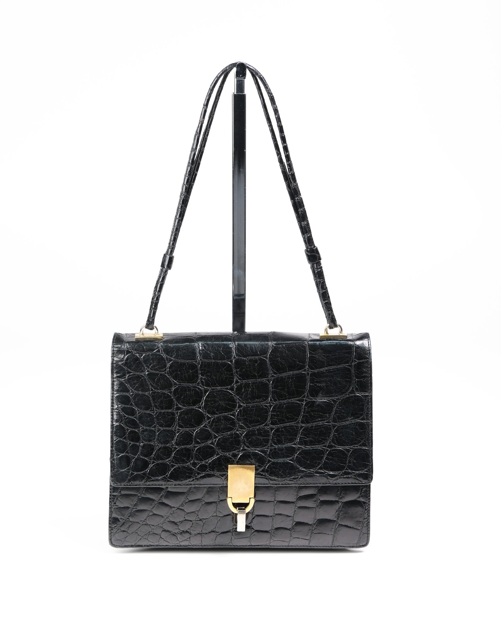 Borsa in pelle stampa cocco  a spalla  anni 60  in un nero profondo con hardware color oro, chiusura con meccanismo ad incastro. La borsa ha uno scomparto con due tasche interne una con la zip.