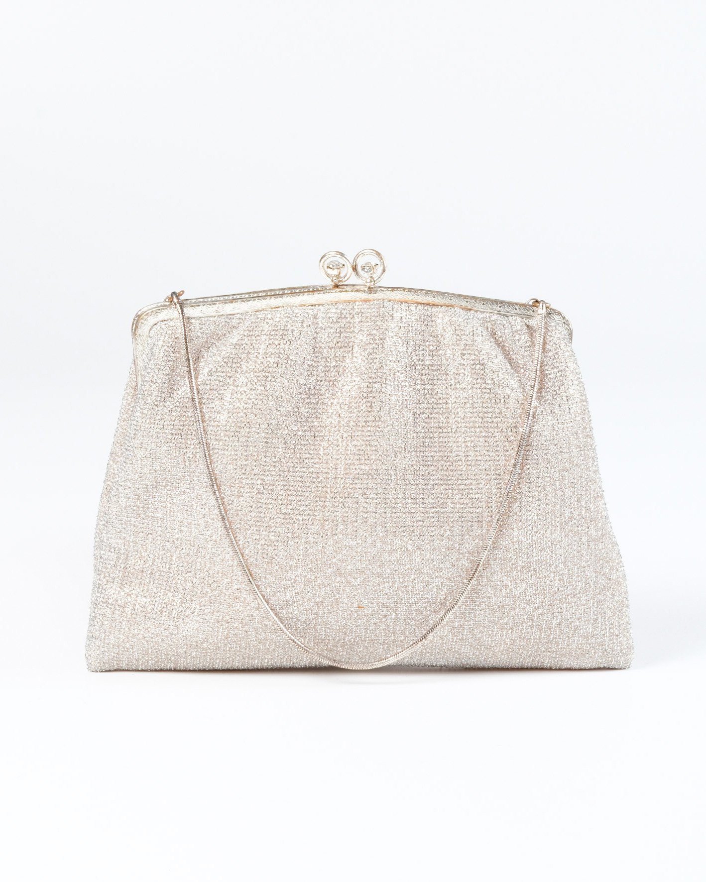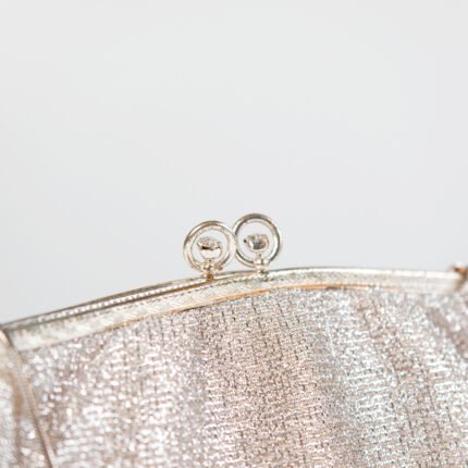 Borsa da sera anni 40 in lurex argento con catenina metallica e chiusura a scatto con dettagli di swaroski , visti gli anni è in perfette condizioni .