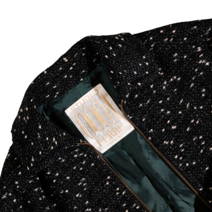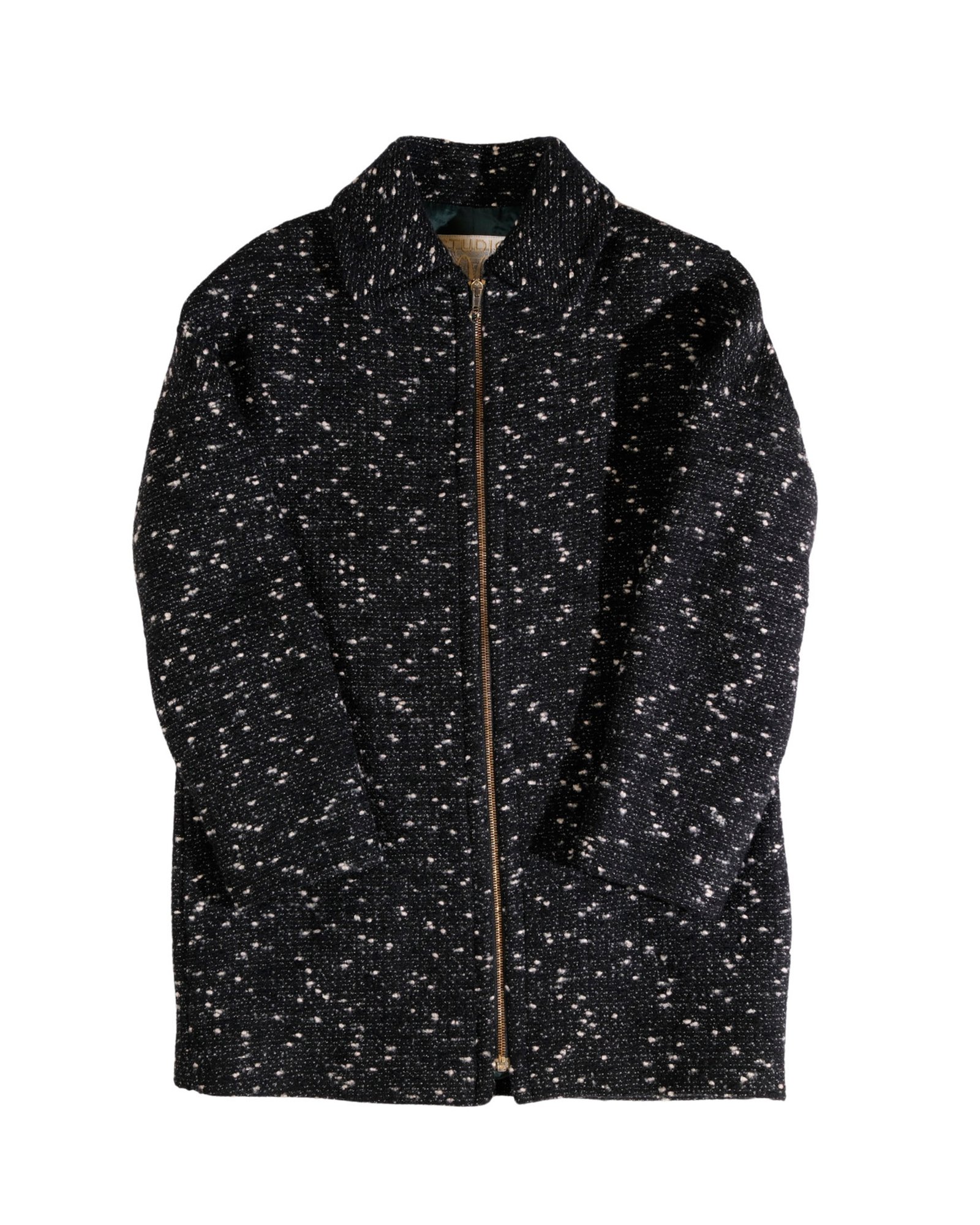 Cappotto corto in lana bouclè bianco e nero con colletto classico. Chiusura con cerniera ,completamente foderato. L’etichetta non è più presente ma io ne ho uno identico ed e in pura lana.