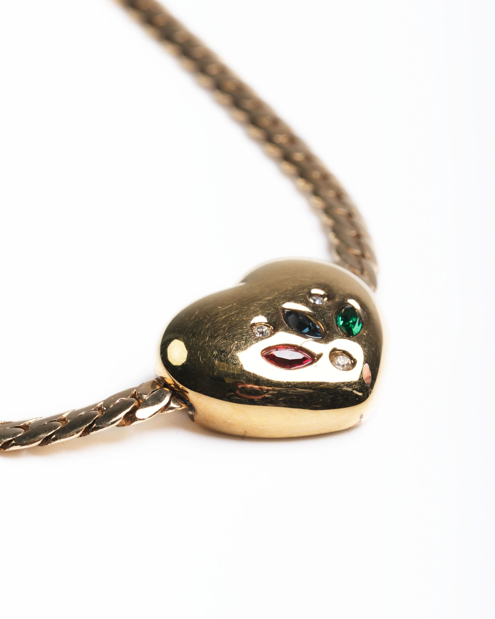 Collana con cuore anni 80 con maglia a grumetta piatta e chiusura a gancio, cuore con pietre rosse verde e azzurra e  brillantini, molto raffinata.
