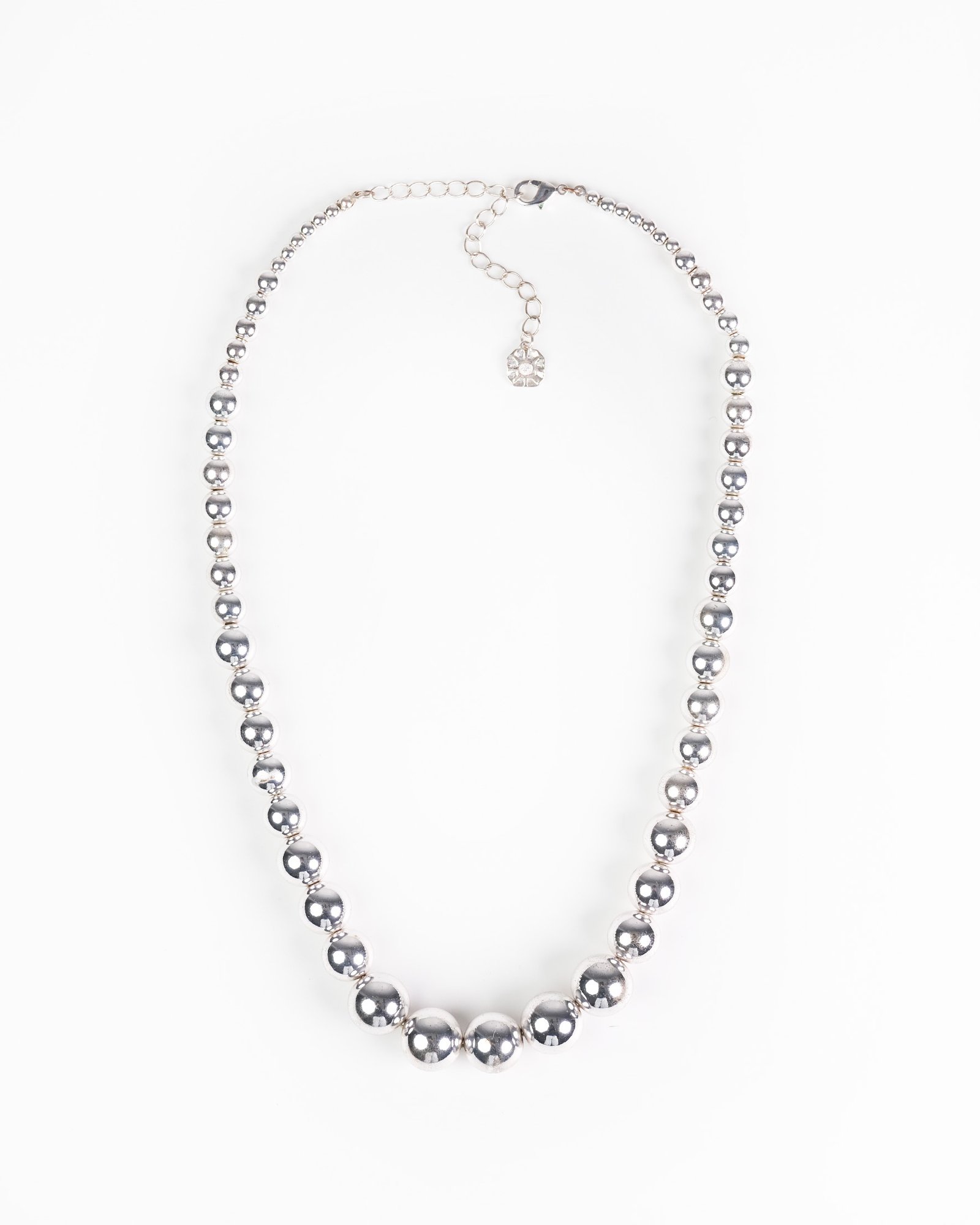 Collana Monet anni 80 con perle di metallo a sfera graduate, chiusura regolabile con moschettone, hanno delle leggere scoloriture dovuta all età e il prezzo ne tiene conto.