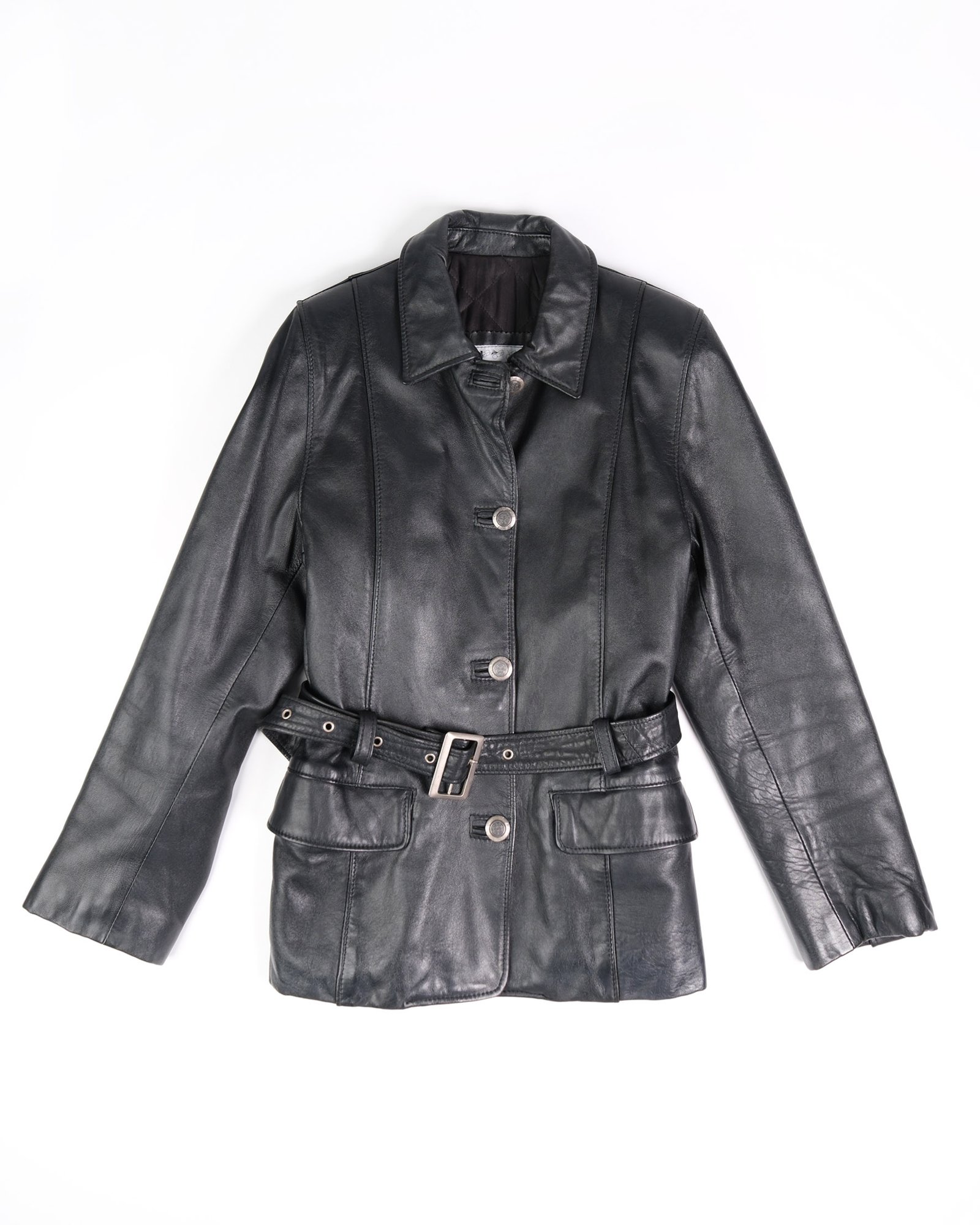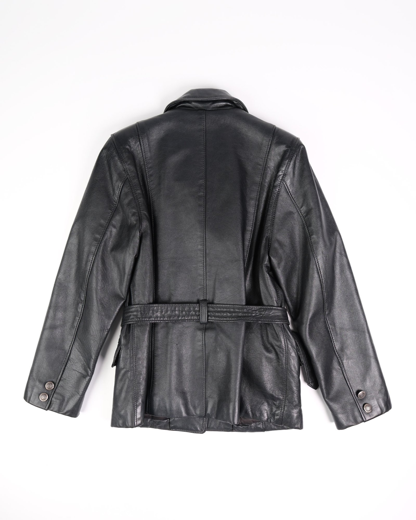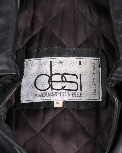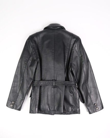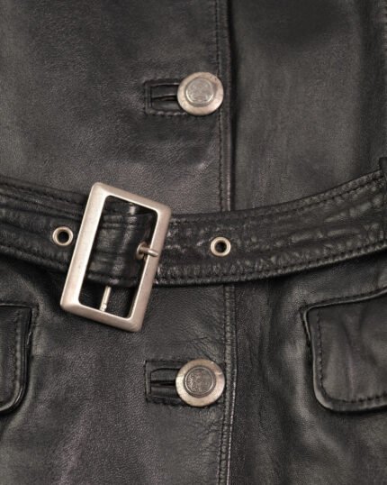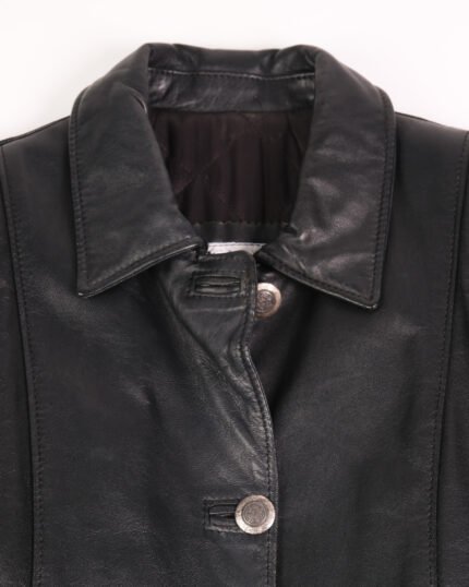 Giacca in vera pelle nera, con bottoni in ferro, realizzata in una pelle molto morbida e flessibile al tatto, leggermente imbottita. La linea è molto strutturata , con cintura in vita così da segnare il punto vita. I revers classici, le tasche applicate rendono il capo più funzionale. La finitura liscia della pelle, con una leggera lucidità naturale, valorizza ancora di più la qualità del materiale.