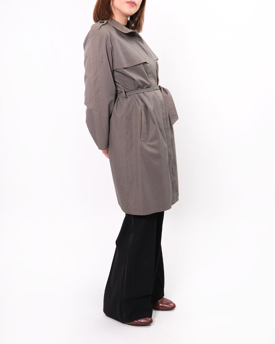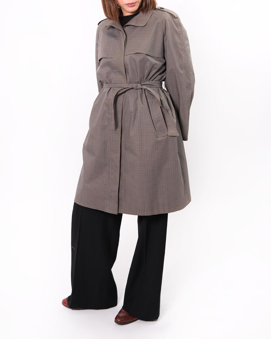 Treanch Herno vintage in trama vichy molto piccola sui toni del grigio. Trench con colletto classico, 2 tasche a con patta, cintura in vita , abbottonatura centrale nascosta, pattine con bottone  sulle spalle, mantelline sul petto e sul retro .