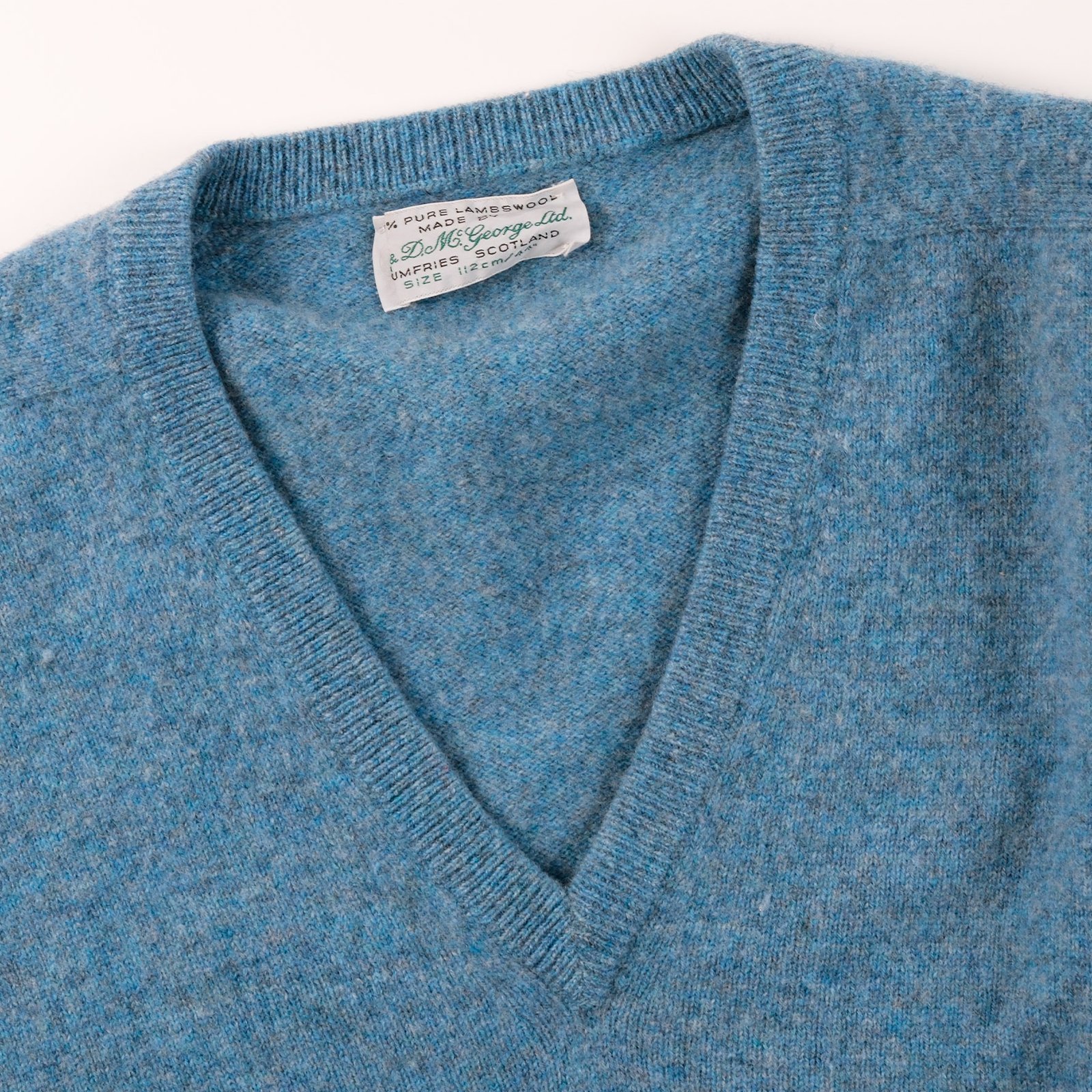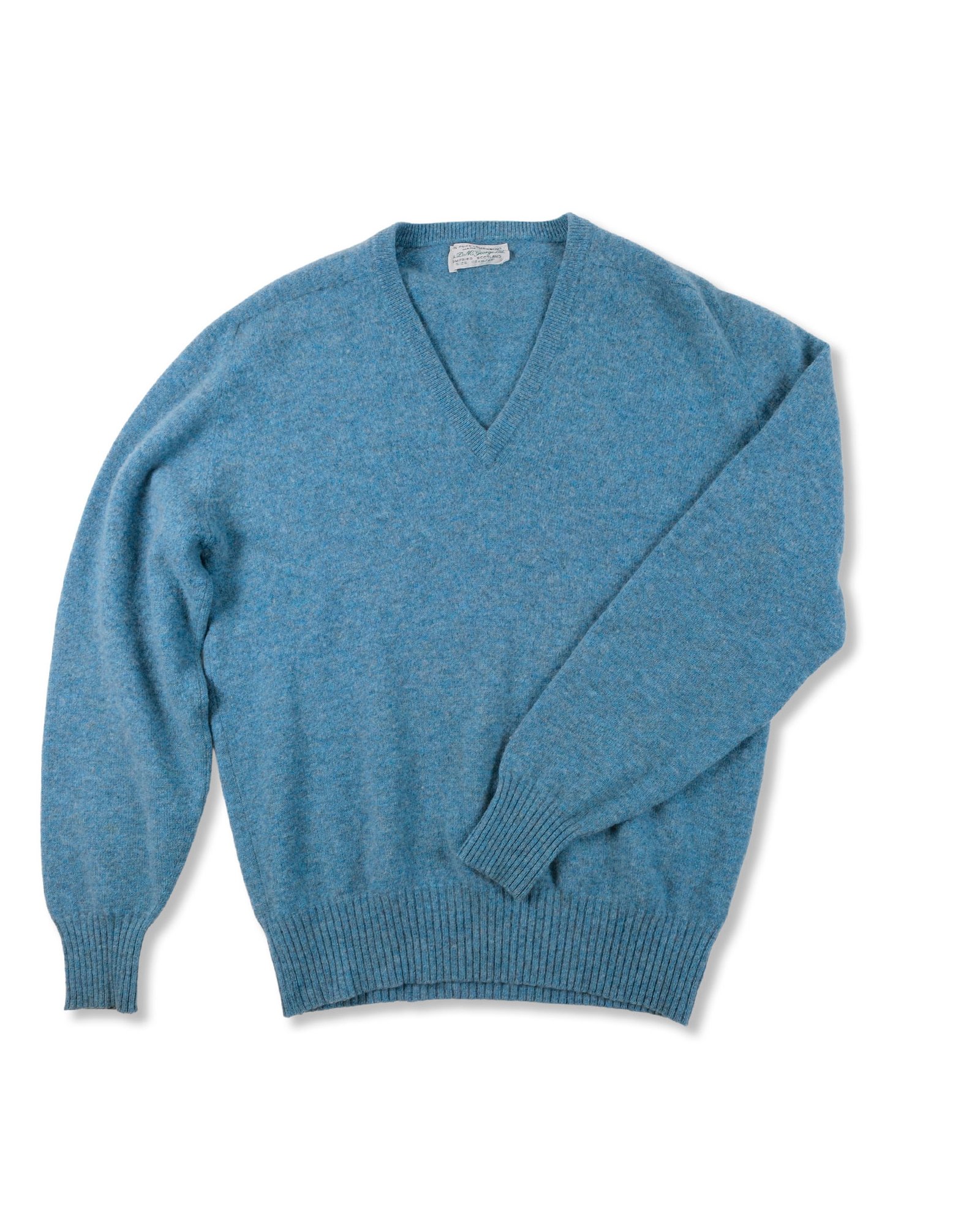 Maglione Mc George of Dumfries made in Scotland anni 70/80 in 100% lana vergine in una bellissima tonalità azzurro polvere con scollo a V .