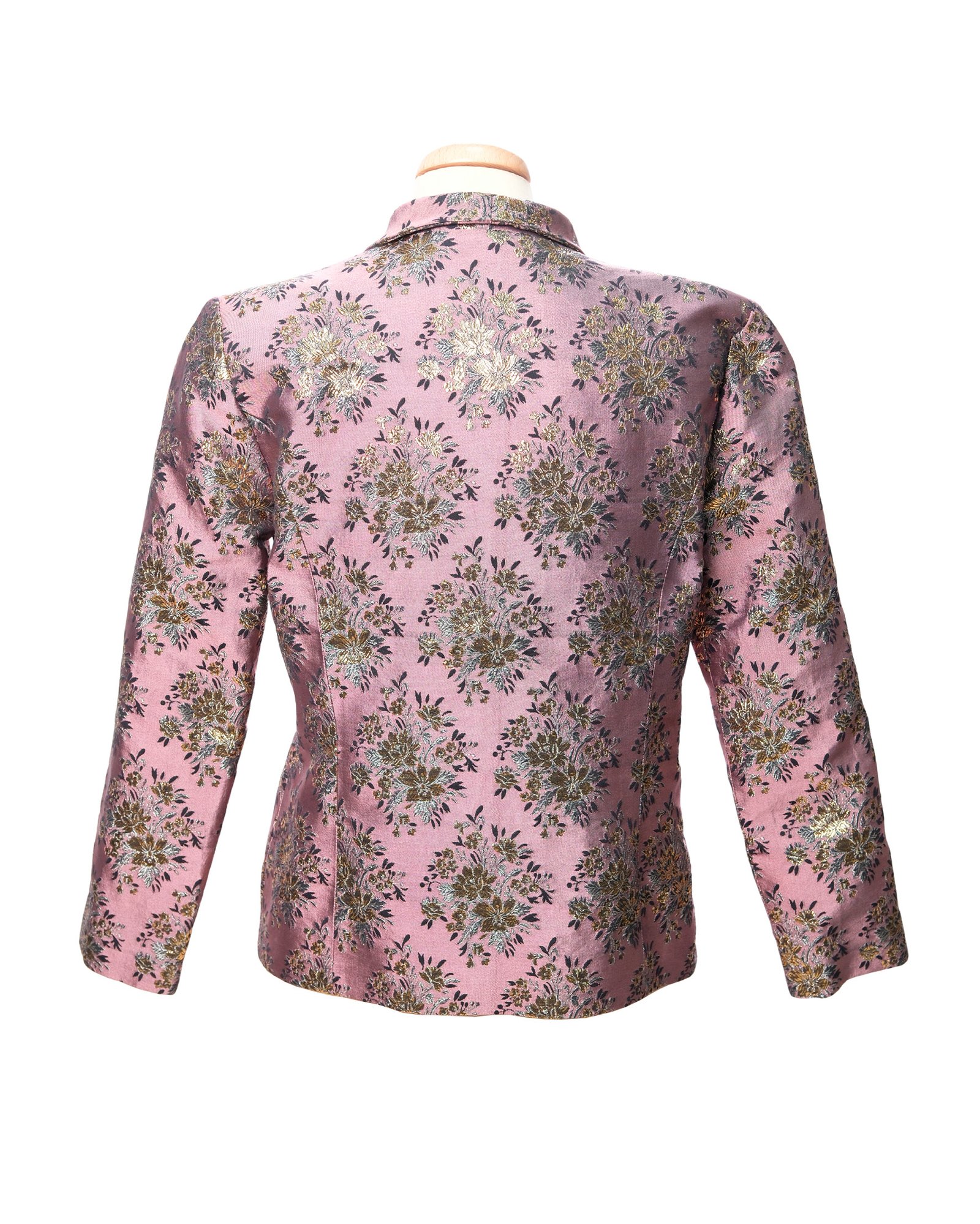 Giacca sartoriale  dallo stile orientale con alamari mandarin, in jacquard con filo lamè, fodera interna in seta. La vedete indosso al manichino perché a me non va, immaginata con un pantalone a pinocchietto nero e mules molto anni 90.