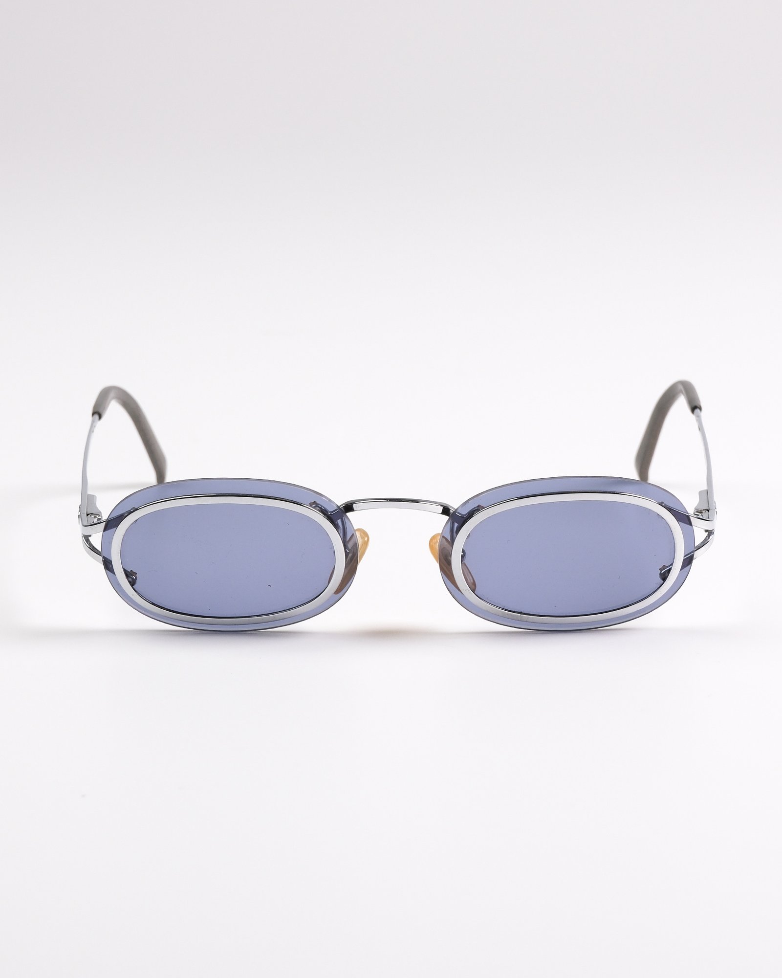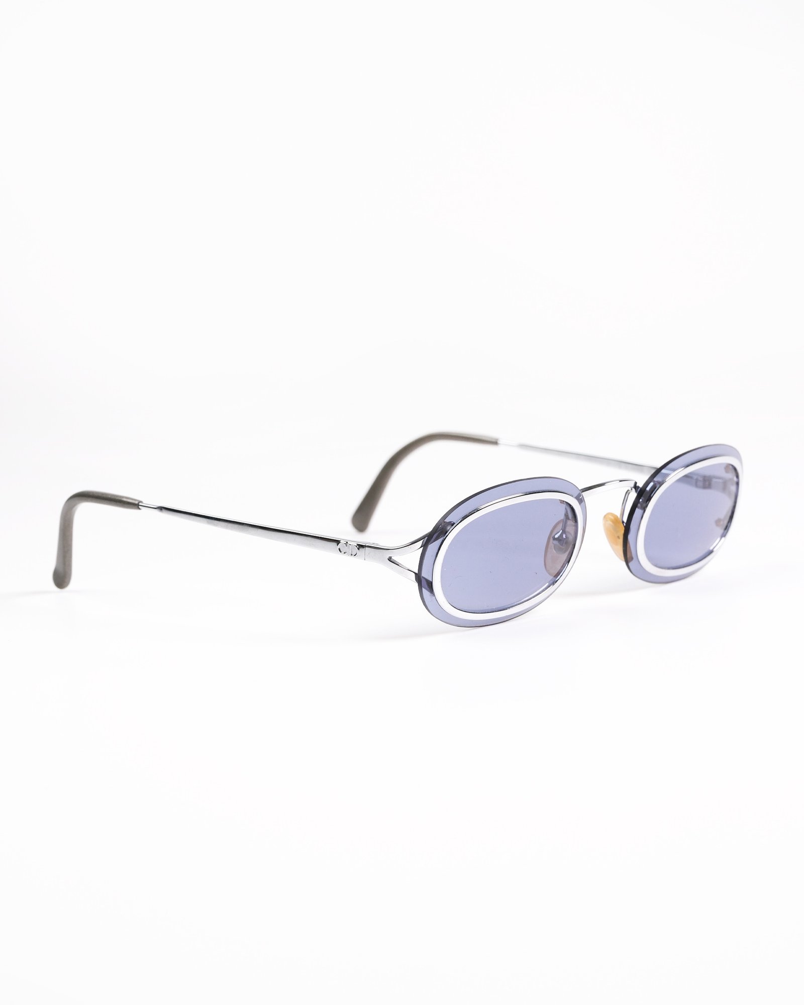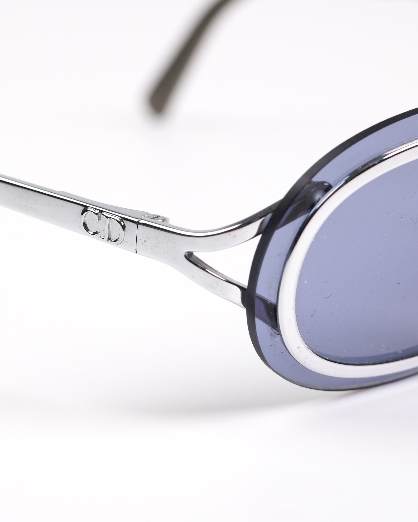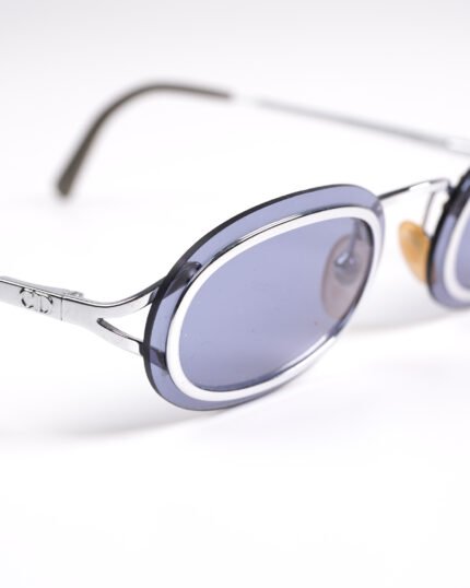 Occhiali da sole Christian Dior  anni 90,modello raro di occhiali da sole ovali con cerniere a molla , costruzione senza montatura (le lenti sono avvitate alla montatura) in argento , le lenti sono in policarbonato blu/grigio per una protezione UV al 100%. Con la sua custodia originale.