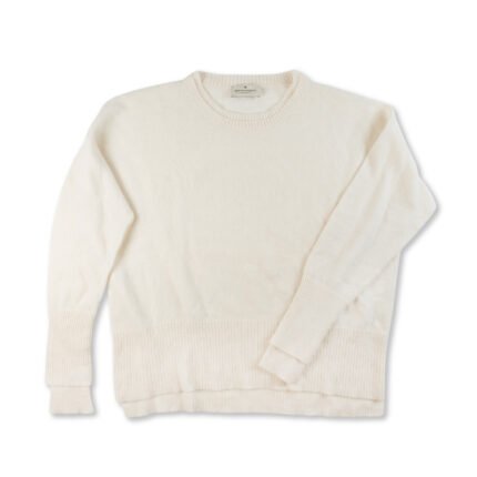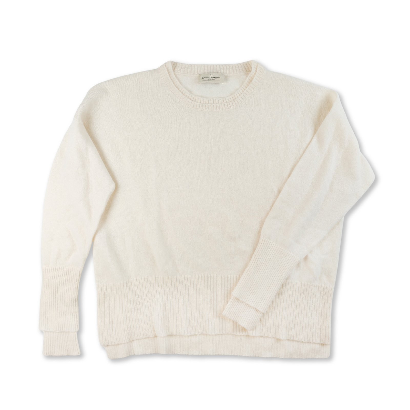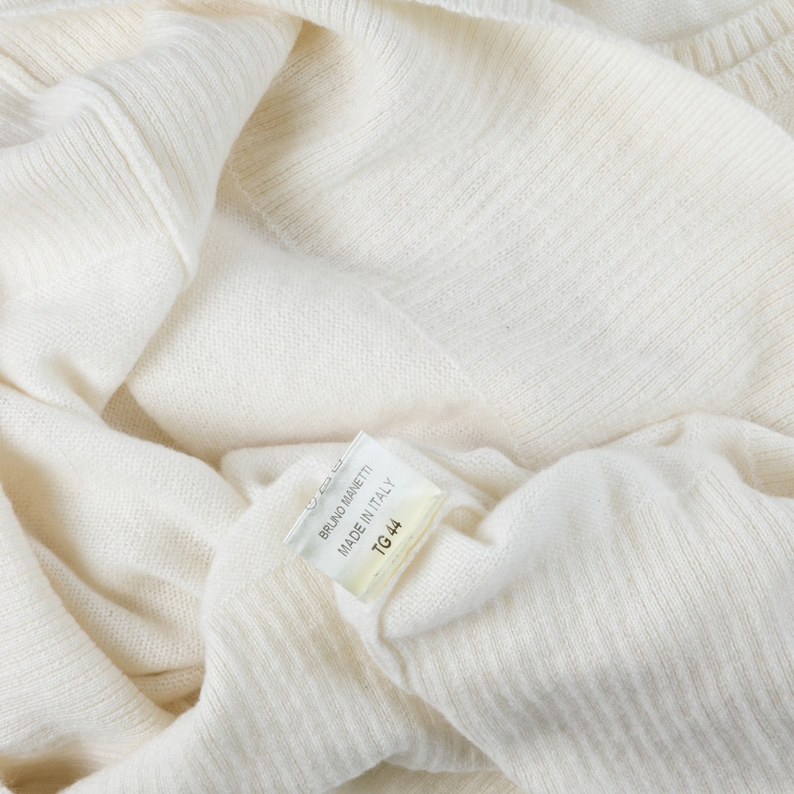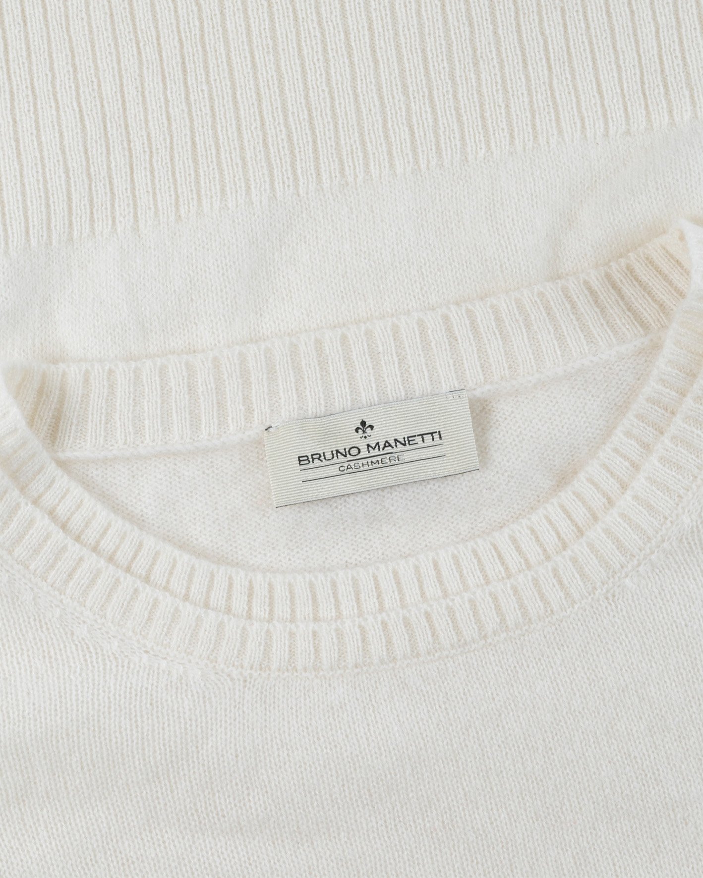 Maglione Bruno Manetti in puro cashmere bianco con dettagli molto particolari , doppia costina al collo e doppio polsino .
