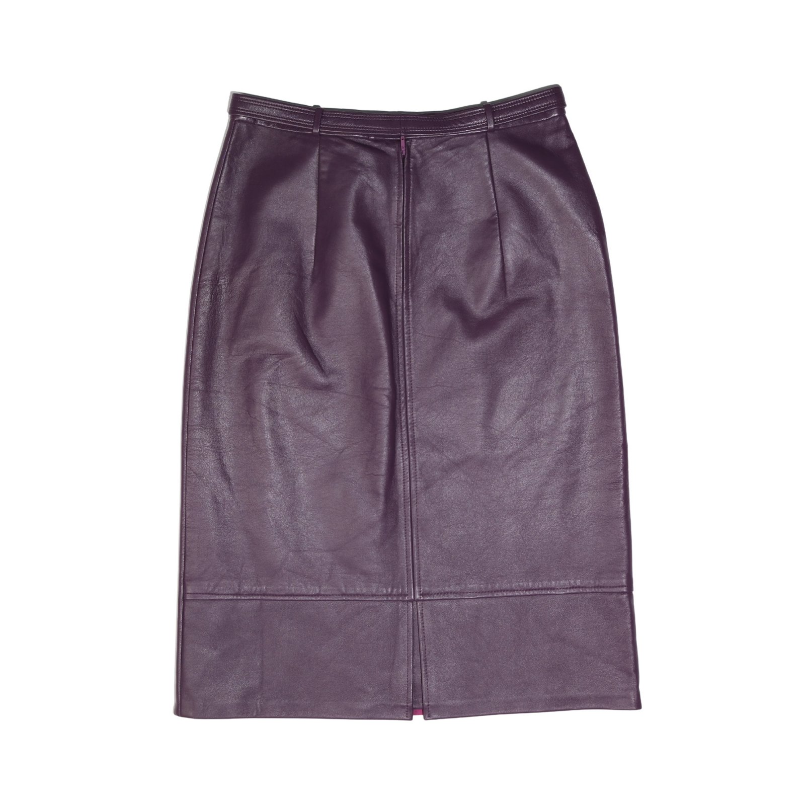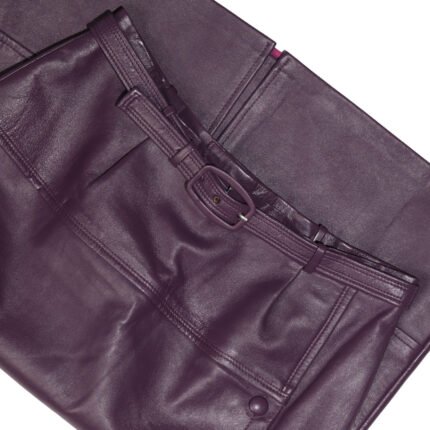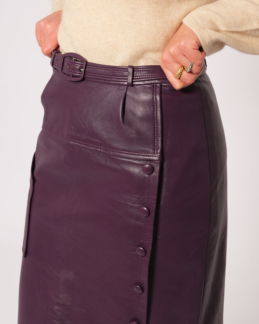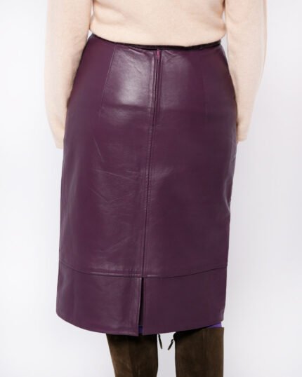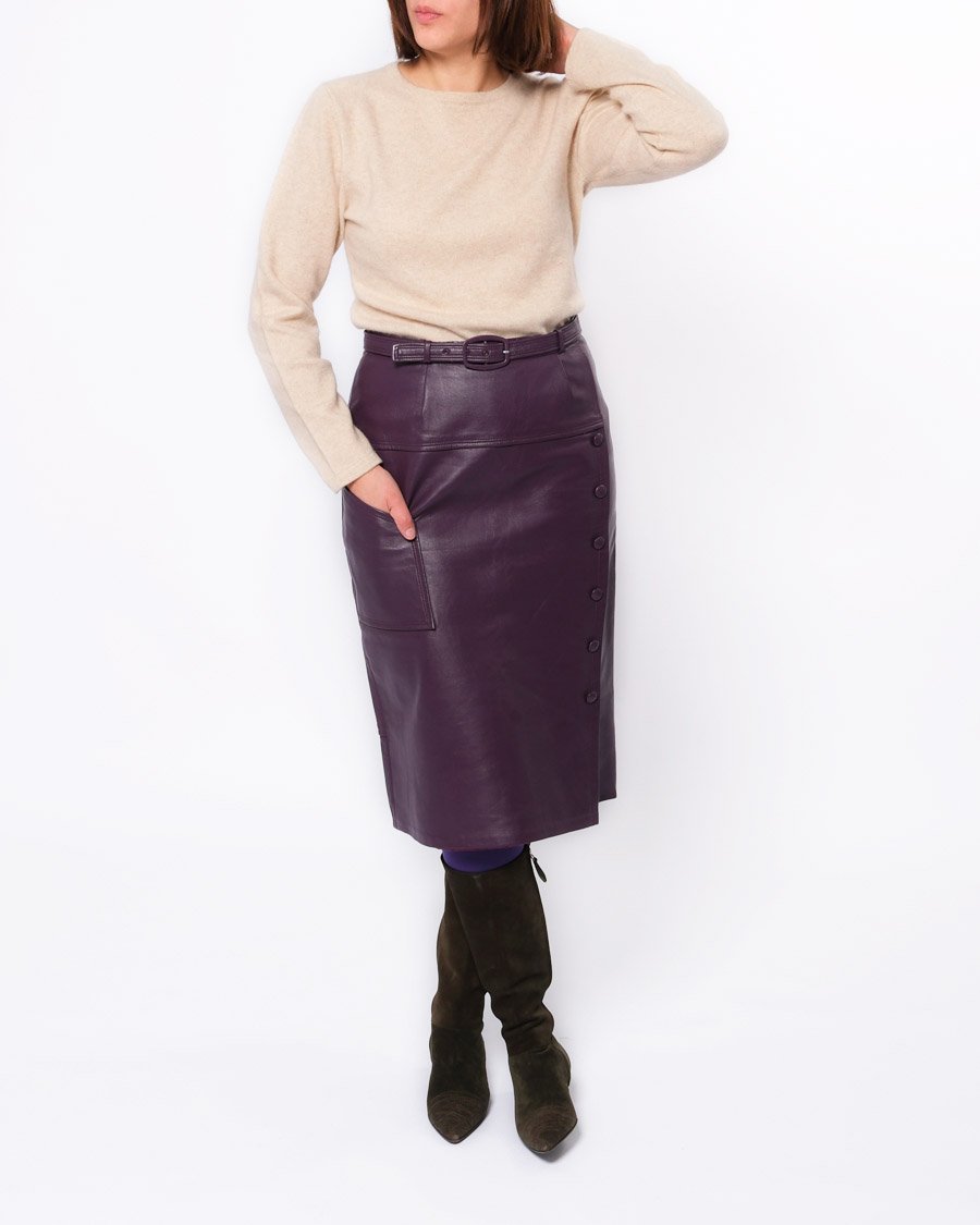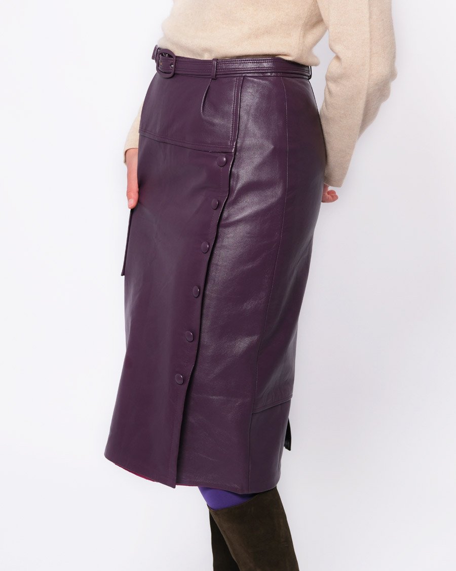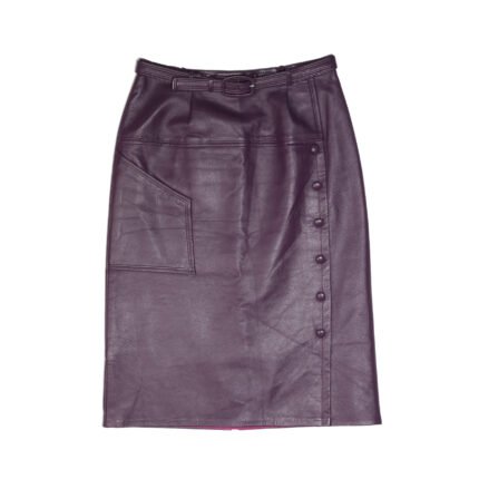 Gonna in vera pelle, foderata. Bellissimi i bottoni sul lato sinistro e dettaglio della tasca sul lato destro, cintura in vita chiusura sul retro con zip e bottone.