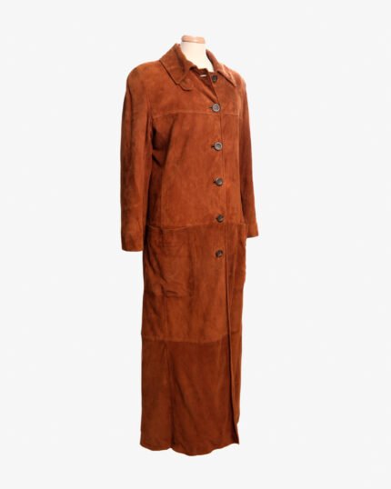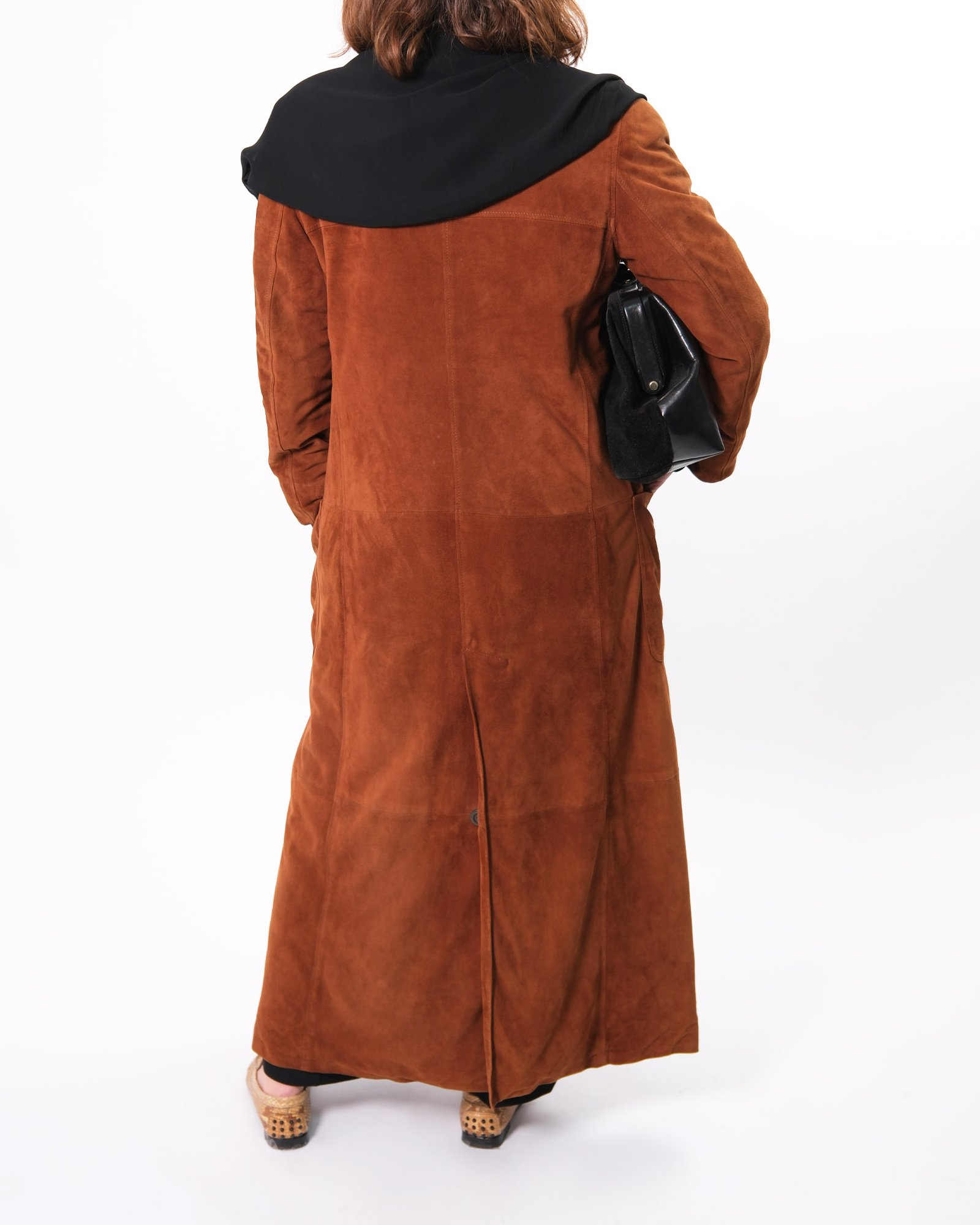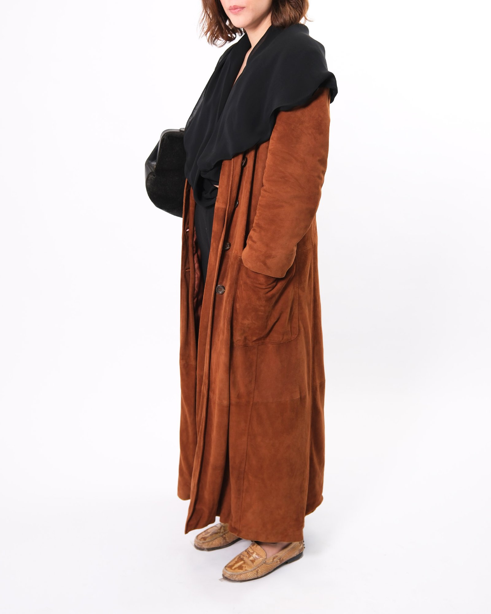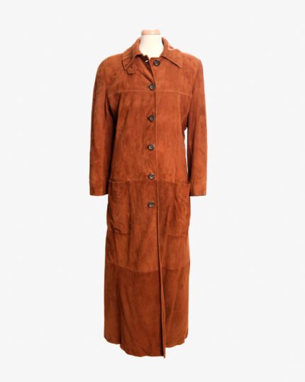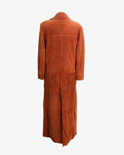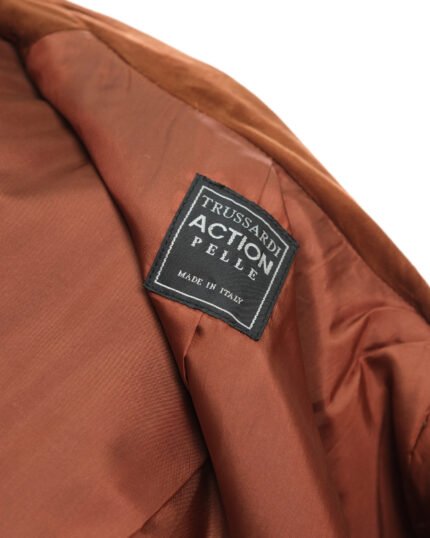 Trench Trussardi in pelle scamosciata lungo con linea diritta, abbottonatura centrale, 2 tasche sul davanti, colletto classico, fodera interna leggermente trapuntata e spacco posteriore.